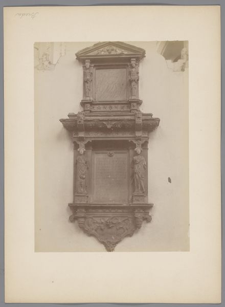 Curator: Here we have Mèdéric Mieusement's photographic portrait, "Kast met reliëf, afbeeldingen en potten," placing it within the period of 1850 to 1900. The photograph captures a wooden cabinet adorned with relief carvings, displayed alongside various vessels, and is part of the Rijksmuseum collection. Editor: It's such a deeply shadowed image. Immediately, I'm drawn to its stillness and sense of weightiness. You can almost feel the cool interior of the room, the density of the wood. There's an element of antiquated masculinity; how do you interpret that? Curator: Indeed. Observe how Mieusement frames the cabinet. The relief carvings, which I interpret as narrative elements, are positioned centrally, while the pots above and below, while functional, offer structural balance. The contrasting textures of wood and metal are rendered meticulously through tonal gradations in the photograph. The cabinet itself is clearly intended as a monumental cultural symbol. Editor: Agreed. And to understand that symbolism, we need to place this within a socio-historical frame. The meticulous detail, almost reverential lighting… this cabinet signifies more than just utility; it’s a display of power, an assertion of status. Given the date, wouldn’t you agree that the artist may be exploring evolving conceptions of nationalism or perhaps empire-building itself through this intimate scene? Curator: Undeniably. Mieusement uses composition, tone and subject here as rhetoric. The high level of craftsmanship in both cabinet and vessels are visual testaments to that assertion. Though of course, the technical limitations of the photographic process at this stage likely contribute a romantic sensibility also. Editor: Precisely! The shadows play an important part in that mood, softening potentially boastful display to something altogether more enigmatic, less accessible. It renders the entire scene somewhat melancholic; perhaps hinting at a longing for a past age. It almost beckons towards deeper questioning of its initial intent. Curator: Yes. The strategic arrangement of elements elevates this image from mere record keeping to careful constructed statement; and those subdued elements enhance that statement rather than detract from it. It encapsulates not merely a thing but also perhaps its complex history. Editor: The muted color of the photograph underscores all those ideas that we both brought up. Its antiquated tones serve to emphasize that theme perfectly! Curator: I quite agree; the tonality indeed binds material presence and the suggestion of history, inviting layers of interpretation.