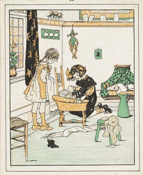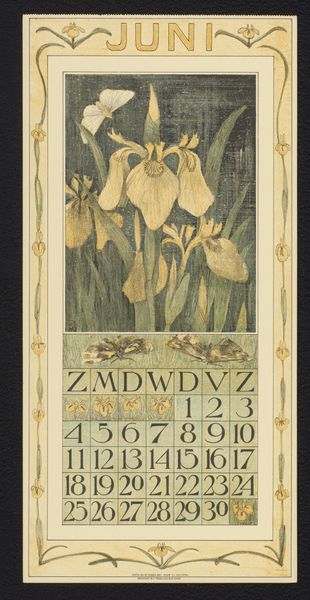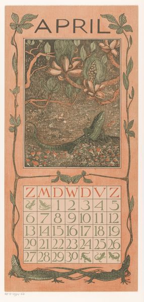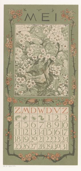 Curator: Well, doesn't this just look like a whimsical rainy day? I adore the way this piece just oozes fin-de-siècle melancholy, like a rainy Tuesday afternoon spent dreaming of sunnier skies. Editor: Theo Nieuwenhuis created this "Kalenderblad voor Maart 1898," calendar sheet for March 1898, in 1897. What I find particularly compelling here is how he encapsulates the experience of societal mood through something as simple as a calendar. Curator: Absolutely. It’s not just functional, it's a mood ring for a whole month! Look at how the rain sort of...weeps down the sides. And those adorable figures with their little umbrellas! Each an individual trapped under the gloom of inescapable days. Editor: Yes, the figures draw me in, too. But the decorative nature is so interesting as it relates to production. Think of how printmaking enabled artists to make art accessible to more of the public, embedding those moods within daily life. Curator: You know, I always imagine Nieuwenhuis sketching these out on a damp morning, inspired by his neighbor's grumpy walk to work! The humor is just subtle enough to balance the heavier feeling of impending Spring in a perpetually overcast climate. Editor: I appreciate how you interpret the neighbor! Thinking through a contemporary lens, I'm thinking about weather as it intersects with socio-economics, climate change, health...How do we prepare or reconcile with inescapable days? It has me thinking about the work of laboring, especially for marginalized groups and within this region. It looks like such simple Art Nouveau, but it brings to mind important issues. Curator: Precisely, beneath the pretty surface there's that quiet questioning—the calendar, after all, is a record of our brief dash through time. Editor: So true. It’s a beautiful reminder that art, even something as unassuming as a calendar, can open up crucial dialogue. Thank you for sharing these brilliant insights with me today!