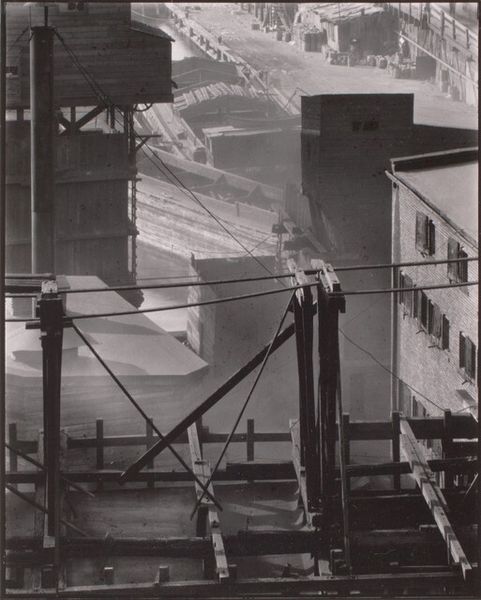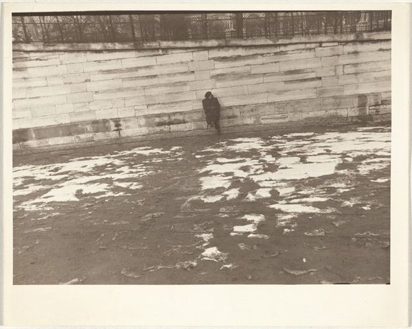 Editor: This is an untitled photograph by Jack Gould, showing men with a policeman in front of a building. It looks like a study in contrasts, between the figures and the architecture. What do you see in the composition of this piece? Curator: The stark contrast between the figures and the austere geometry of the building creates a visually compelling tension. Note the repetition of rectangular forms—windows, panels—and how they interact with the organic shapes of the individuals. The composition invites a semiotic reading of power and containment. Editor: So, the building acts as a kind of visual constraint on the people? Curator: Precisely. Consider how the limited tonal range and the photographic process itself contribute to the overall sense of detachment and observation. What does that imply to you? Editor: I hadn't thought about that. The formal qualities really shape the narrative. Curator: Indeed. It's a fascinating exercise in visual language.
