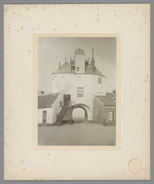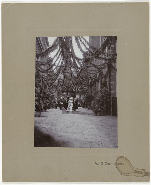Curator: The photographic print before us, likely from 1887, captures the throng in Willemstraat during the Aprilfeesten. The gelatin-silver print is attributed to Henri de Louw. Editor: It has an undeniably quaint feel, doesn't it? The muted tones and slightly blurred figures evoke a bygone era, yet that floral archway, the central form in the image, appears almost surreal. Curator: Indeed. This photograph offers us a glimpse into the festive culture of the time. The Aprilfeesten were celebrations often rooted in civic pride and sometimes, in political statements depending on which period in Dutch history. The massive, decorated arch signifies community and perhaps allegiance. Editor: That arch! The semiotic weight of that thing is heavy. It acts as both a frame within the frame, drawing the eye, and a barrier. The inscription, although faded, hints at the purpose: a constructed threshold mediating space, access, and collective identity. It has almost a mythical connotation. Curator: The photographic technology of the time shaped the composition. Longer exposure times would necessitate capturing posed or still subjects. The crowd, however, gives us the life of the event even as some parts appear blurry due to movement. It is a nice juxtaposition. Editor: What also interests me is how the cityscape, the structures that serve as background, dictate so much of the image’s formal vocabulary. Observe how they echo and amplify lines in the lower parts of the photograph. Curator: Precisely. De Louw masterfully utilized existing architecture. In this instance it's to not only showcase a street scene, but to record civic ritual and also create art in the process. It's about freezing a public, collective action through technical innovation. Editor: To see that moment of convergence through De Louw's photographic work is incredibly engaging, an old form representing social structure. I find that duality to be both haunting and insightful. Curator: The interplay of light and shadow enhances the scene's emotional texture too, it is hard to leave such qualities unaddressed. The photograph encapsulates a shared moment of historical vibrancy. Editor: A remarkable interplay between documentation, artistry, and cultural record—I must agree.