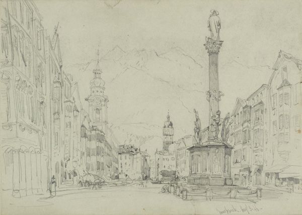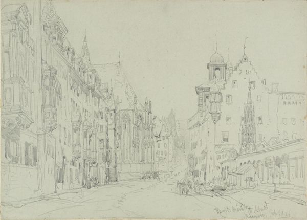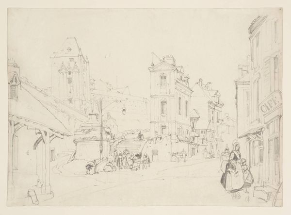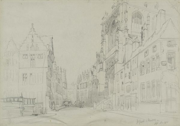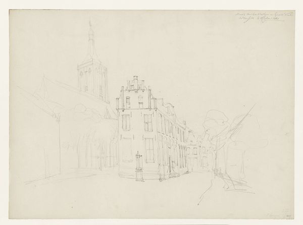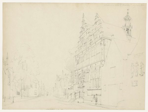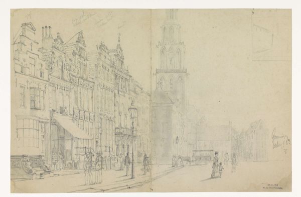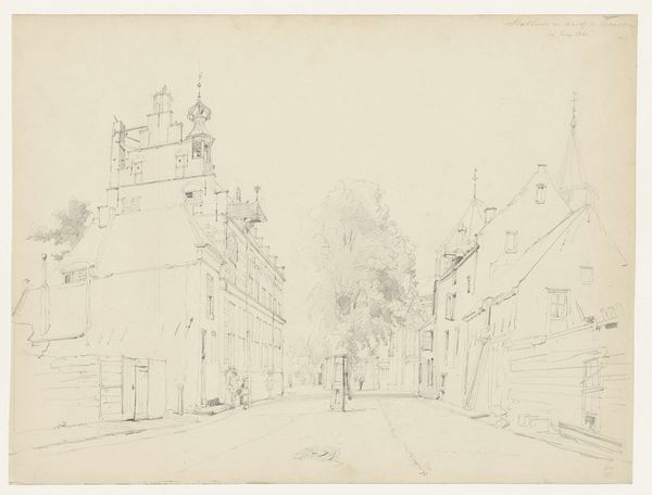 Cornelis Springer created this graphite drawing, "Gezicht te Workum," and it's now held at the Rijksmuseum. The composition is dominated by architectural forms meticulously rendered with delicate lines. The buildings, with their varying heights and intricate facades, line the street, creating a sense of depth emphasized by linear perspective. Springer's treatment of space is particularly interesting, with the street receding into the distance, drawing the viewer's eye towards the horizon. This calculated arrangement gives structure to the urban landscape. The sketch captures a moment frozen in time, the artist's hand evident in the precise yet subtle variations in line weight and shading. This formal approach to capturing the cityscape can be interpreted through the lens of structuralism, revealing an underlying order. The buildings and figures, as signs, contribute to a larger system that represents urban life. The drawing destabilizes any singular reading, inviting ongoing interpretation of its architectural and social space.