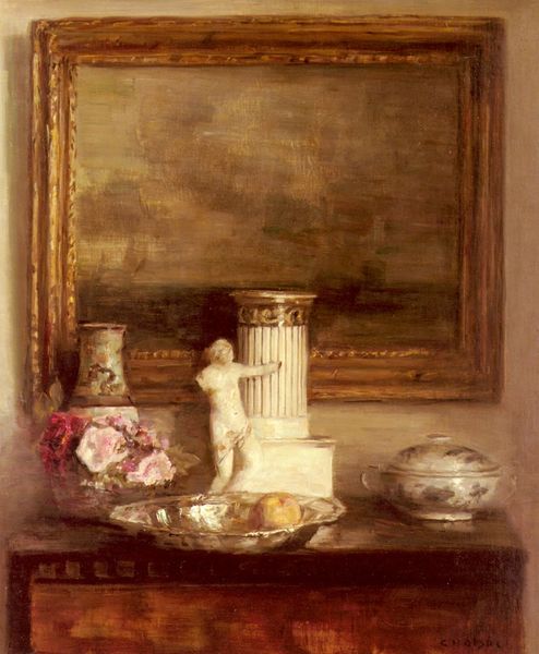 Carl Holsøe painted this "Interior" with oil on canvas, capturing a domestic scene where light plays as a central motif. The composition emphasizes vertical lines and a subtle palette that evokes a sense of quiet contemplation. The way Holsøe arranges objects—plates, pictures, a chandelier, and a vase—on the wall creates a structured yet intimate space. These are echoed by the lines of the table below, which support a silver tray. The most striking element is the light; it floods the scene, highlighting the textures and the materiality of the objects, and almost dissolves the forms into a play of illumination. The strategic use of light and shadow creates not just a visual experience but also suggests a deeper engagement with themes of presence and absence, visibility and concealment. Holsøe invites us to consider how light, as a formal element, structures our perception and shapes our understanding of interior space.