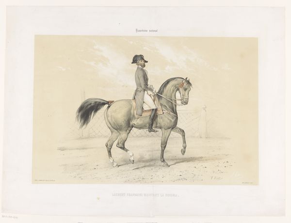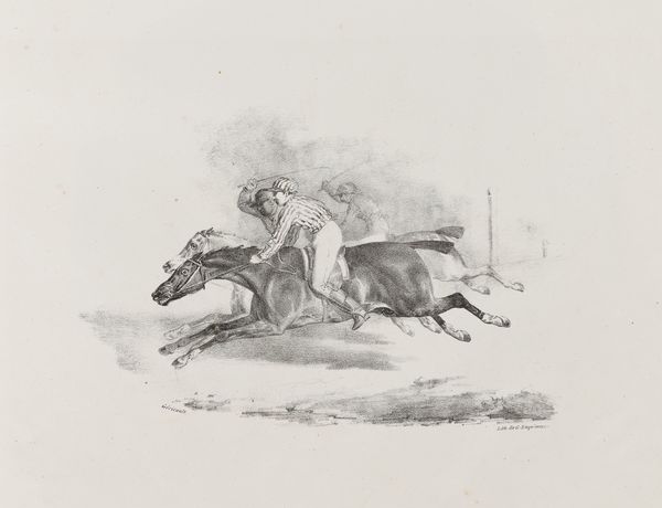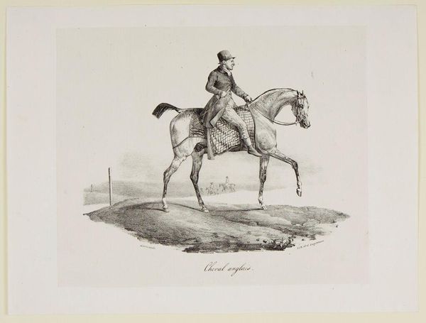Théodore Géricault created this lithograph, "Cheval Anglais," the French term for English horse, around 1823. Gericault had a well-known fascination with horses and the military during a period of French history marked by political upheaval. The artwork serves as a window into early 19th-century European society, where equestrian culture was intertwined with class and national identity. Horses were not merely beasts of burden but symbols of wealth, status, and military might. The ‘English horse,’ specifically, suggests a certain level of admiration, perhaps even envy, from the French artist towards British equestrian traditions. In the lithograph, we see a man riding with purpose, suggesting a narrative of control and authority. It prompts us to consider whose stories are being told and whose are being left out. Whose freedom and status is assured through the control of such a magnificent animal? The print offers a glimpse into a world where power, prestige, and national identity were visibly displayed through the ownership and mastery of these animals.