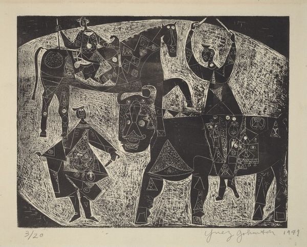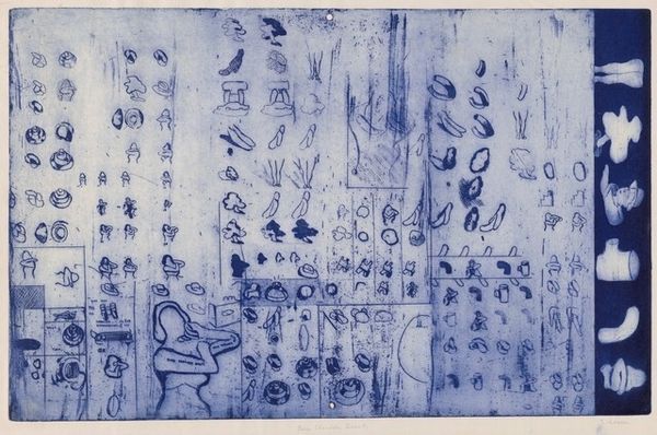 Ynez Johnston made this print, Square with Monuments, and the image is teeming with tiny marks. It looks like a city, or maybe a dream of a city, built from the ground up with marks made by hand. The texture feels almost granular, like sand or tiny stones pressed into the surface, and there's a real physicality to the medium. You can almost feel the artist's hand moving, pressing, and lifting, making each tiny mark. Take a look at the pyramid shapes and the figures with little triangular bodies, like cut paper collage. See how each shape is different, yet they all fit together? It’s like she's inventing a new language of form, one shape at a time. Johnston's playful approach reminds me of Paul Klee, who also loved to mix abstraction and representation in his work. Like him, she embraced ambiguity, inviting us to get lost in the details and discover our own meanings.