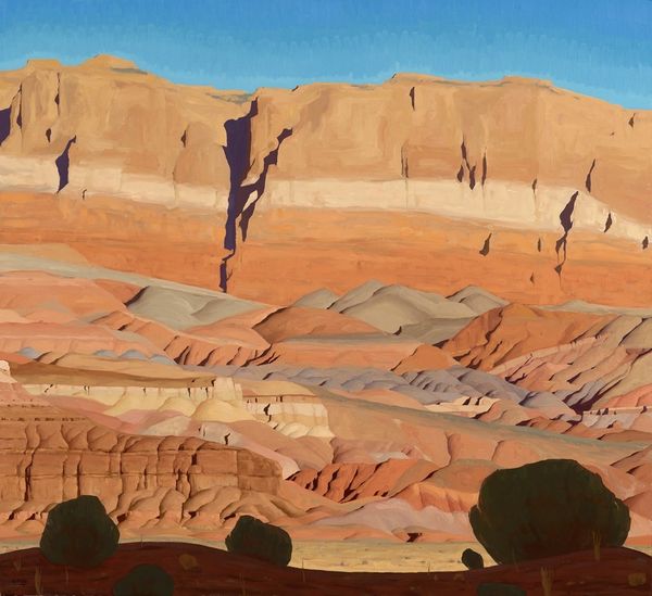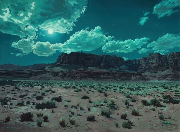Logan Maxwell Hagege created ‘Crawling Light’ as a modern take on the landscapes of the American Southwest. The artist blends a traditional subject with a contemporary style, inviting us to consider how landscapes can be both familiar and new. The painting’s simplified forms and warm color palette evoke the iconic imagery of the West. ‘Crawling Light’ can be read in terms of the cultural and economic factors that shape our perception of landscape. From the early 20th century, the American West was promoted through art and advertising, which romanticized the region and its people. Hagege’s style, which echoes the aesthetics of commercial art, invites us to consider the ways in which the art market promotes certain images of the American West. Historical research, considering the influence of early advertising and the development of tourism in the Southwest, can reveal the powerful role of art in shaping our understanding of geography and culture.