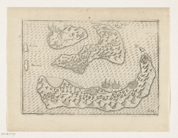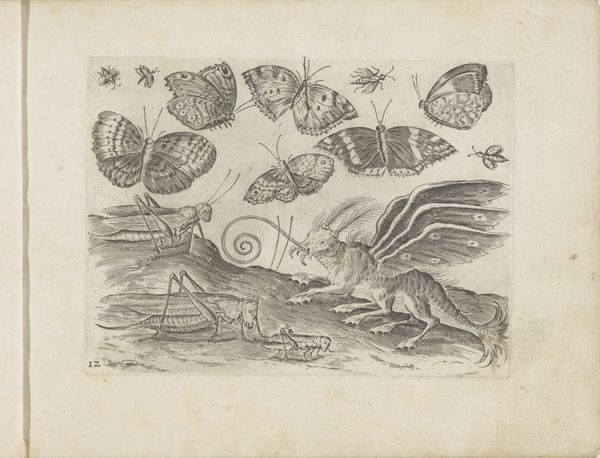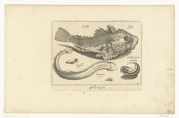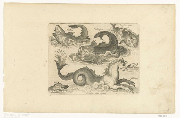 Curator: Immediately striking! There's something both unsettling and whimsical about these creatures. Editor: That's quite a first impression! This is a drawing by Nicolaes de Bruyn from the late 16th to mid-17th century, entitled *Fantastische waterdieren, onder andere dolfijn en pitvis*, rendered in ink using an engraving technique. Curator: The word 'fantastische' is certainly fitting. They resemble fish, yes, but the exaggerated features and almost comical expressions… it’s as if they belong to a mythological bestiary. There’s definitely an uncanny valley effect at play here. Editor: I agree; these are more than simple fish. I'm drawn to the fine lines of the engraving, the way it defines the forms and suggests texture. Observe the almost mathematical precision in the depiction of the fins on those bottom figures, counterposed with the fluidity of the water lines above. Curator: It's interesting you point that out, that duality is echoed throughout the composition! Look at the naming just above each one, the naming of each animal feels more important than the actual image. This speaks to a culture fascinated by classification, yet forced to reconcile scientific impulses with fantastical beliefs. Remember, the sea was still largely unexplored. Anything seemed possible. Editor: Good point. I didn't register those names right away, perhaps I'm not attuned enough to the etymological background to fully interpret this one. Speaking of exploration, do you find the placement of these beings intentional at all? It feels as though they've simply been scattered for our viewing. Curator: On the contrary, I sense a very subtle hierarchy at play, Editor! The so-called dolphins occupy the highest register; perhaps it’s suggesting an established understanding of marine order. Editor: Hmmm… Perhaps! Either way, de Bruyn's piece is intriguing as an emblem of a historical intersection between art, science, and the enduring human capacity for imagination. Curator: Indeed. It reminds us that even supposed objective documentation often reveals just as much about cultural anxieties and fantasies as it does about observable reality.