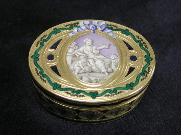 This exquisite snuffbox, by Claude Héricourt, probably from the late 18th century, captivates us with its intimate scale and opulent materials. The dominant visual experience is one of intricate detail. The box’s circular form is emphasized by the swirling, foliate patterns in gold, contrasting sharply with the smooth, dark panels that encircle the box. The miniature portrait set into the lid draws us in; we observe the delicate brushwork of the sitter's face, framed by soft, powdered hair. The circular frame around the portrait echoes the box’s overall shape, creating a cohesive visual language. The object transcends its functional purpose to become a statement about the values of refinement, status, and the personal. The interplay between the geometric and organic forms challenges fixed meanings and engages new ways of thinking about representation. Through its very form, it invites ongoing interpretation, reflecting how cultural codes shape both art and society.