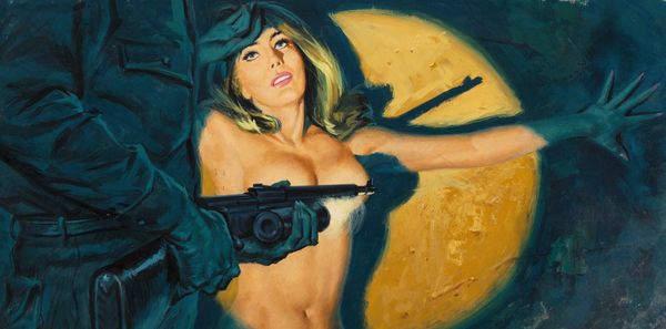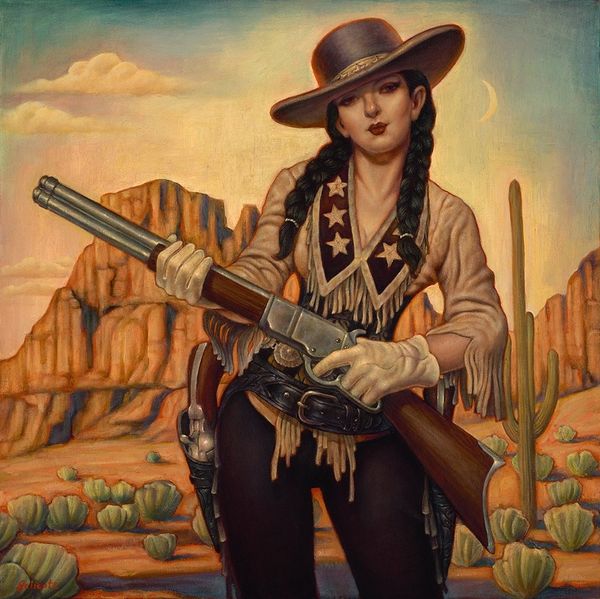Felice House created this painting, Krimmie Crowe in ‘3;10 to Yuma,’ using oil paint, a traditional medium known for its versatility and rich texture. House's application of paint is quite expressive; you can see the brushstrokes layering up to create form, adding depth and energy to the scene. This technique lends a sense of immediacy, as if the artist captured a fleeting moment. The heavy brushstrokes contribute to the overall aesthetic and create a tactile quality, almost as if you could feel the texture of the paint on the canvas. The choice of oil paint is significant here, given its long history in Western art and its association with skill and craftsmanship. But here, it's also used to engage with popular culture, specifically the Western film genre. This demonstrates how traditional materials can be employed in new and exciting ways to explore contemporary themes, while simultaneously pointing back to a tradition of craftsmanship and fine art.