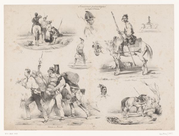 Curator: Here we have "Prøveblad med riddere i harnisk," which translates to "Sample Sheet with Knights in Armour," a lithograph drawing from the period 1795 to 1854, housed here at the SMK. It’s attributed to N.B. Krossing. Editor: It has an ethereal, almost unfinished quality to it. The light washes and delicate line work give the piece a kind of transient feel. Are we certain about the production process? Curator: The museum’s records indicate that it is a lithograph print. This technique allows for multiple impressions, possibly suggesting it was part of a larger series intended for study or reproduction. Consider the socio-political ramifications tied to reproducible image-making during this period. Editor: That raises interesting questions. What kind of labour was involved to bring these knights into existence? What would their roles be in the period depicted? Were they models or caricatures? Also, I notice each knight's posture is carefully calibrated—perhaps it’s trying to convey distinct characters. The plumes, shields, and spear angles all have specific formal qualities. Curator: Precisely. The use of line dictates the narrative—note the rhythmic interplay between dark and light, particularly in delineating the figures’ contours against the negative space. We might posit a structural interpretation based on these arrangements. Editor: Well, it begs the question if the choice of lithography was strategic. Was the artist involved in the process or outsourcing it? Was it about cheaper and faster outputs, intended to flood the market? We need to address not just how it looks but how it came to be materially and how that connects to the burgeoning industrial production of art at the time. Curator: Certainly, a contextual material analysis broadens the artwork's meaning. Still, from a formalist lens, Krossing’s skill in evoking dynamism within a static medium warrants recognition, it has almost the suggestion of movement despite its lithographic flatness. Editor: Agreed. Considering this sheet may have served as a prototype, we see that sometimes the art resides within the labor itself. It's fascinating to glimpse the intersection of artistry and process.