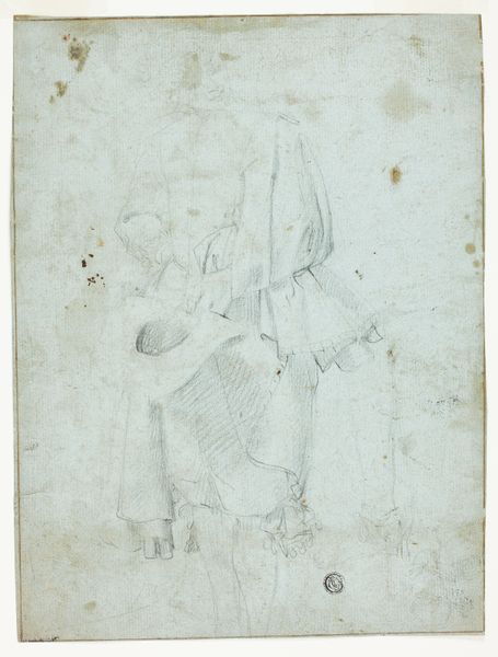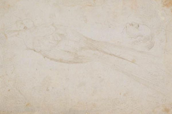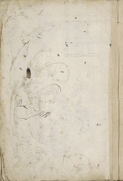 Curator: Let's consider "Svagt rids af en fugl" - or "Faint Sketch of a Bird" by Nicolai Abildgaard from the 1790s, housed at the SMK. It's an ink drawing on paper. What are your first impressions? Editor: Hauntingly minimal, wouldn't you say? It's a mere whisper on the page, ethereal, dreamlike even. What’s most noticeable is the lack of visual weight; everything is so tentative and open to interpretation. Curator: Tentative is a good word. Abildgaard's process seems very open, almost exploratory. We see the texture of the paper, the way the ink bleeds slightly... It tells a story of labor; of the artist's hand at work. He isn’t presenting us with a polished product but an ongoing construction. How does that strike you from your perspective? Editor: That resonates, certainly. What appears faint reveals a complex network of influences—classical themes, Romantic sensibilities and nascent nationalism brewing across Europe at the time. This bird, even faintly sketched, speaks volumes about longing, freedom, perhaps even the fragility of those concepts in a society on the brink of revolution. The figure reaching up could symbolize the desire for upward mobility of the underclasses, while the ruined arch speaks to decaying power structures... Curator: You raise such important contexts for situating it in relation to what’s happening with laborers in his immediate reality, but from a material perspective, look at the economy of line. It's all achieved with such sparse use of ink, and likely quickly done. His artistic labor here also represents an intellectual one, a play of reference. What did paper and ink mean to an artist of his time, who had access to materials that were precious, commodified things. Editor: Absolutely. And that tension is what I find so gripping. We’re dealing with both the historical specificity of these materials—paper, ink—as well as a broader, timeless exploration of humanity’s relationship with nature and with itself, captured in the rise of a human figure and this evocative natural, even romanticized, imagery of the era. It is this tension which keeps a piece like this deeply, perpetually resonant. Curator: Exactly. The apparent simplicity is deceptive. Thank you, that’s given me so much to consider in terms of the modes of artistic labor. Editor: And thank you; reflecting on materiality helped ground this ethereal drawing in tangible struggles.