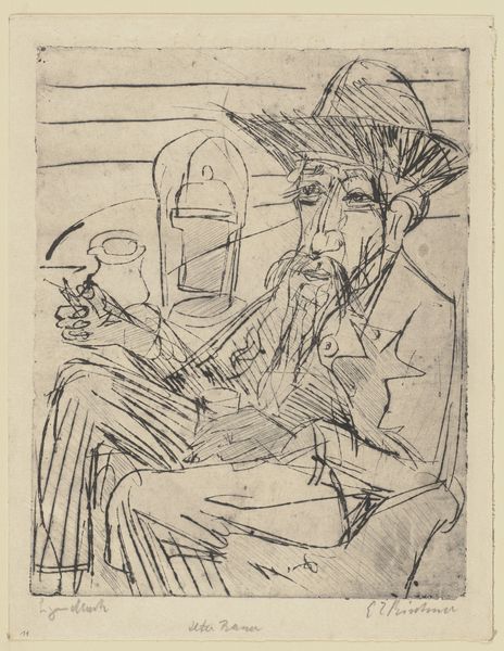 Editor: We’re looking at "Filosoof," or "Philosopher," an etching created by Lodewijk Schelfhout in 1915. It's got this intensely serious feeling, a rather stark figure amidst some interesting almost radiating lines behind his head. What is your interpretation of it? Curator: It’s tempting to view those radiating lines as purely aesthetic, perhaps a Modernist flair. But consider the socio-political climate of 1915. Europe was engulfed in war, and the intellectual class grappled with the failings of Enlightenment rationality. This print becomes more than just a portrait. Editor: How so? Curator: Think about the explicit references to Rousseau, Spinoza, and Descartes. These figures represent the bedrock of Western philosophy, challenged and, to some degree, implicated in the devastation unfolding around them. Schelfhout isn't simply depicting a thinker; he's positioning him within a very specific cultural moment, one where the foundations of thought are being re-evaluated. Does that change how you see the work? Editor: It does. The radiating lines suddenly seem less about enlightenment and more about pressure, almost as though philosophical inquiry is being put under extreme duress. I was just reacting to the visual elements, but context is key! Curator: Exactly! And that's the fascinating thing about art – it's never created in a vacuum. By considering its place within history and society, we can unearth far richer and complex meanings. Editor: That definitely gives me a lot more to consider when I look at art. Curator: And hopefully, it gives you the tools to look at any artwork with a richer perspective.