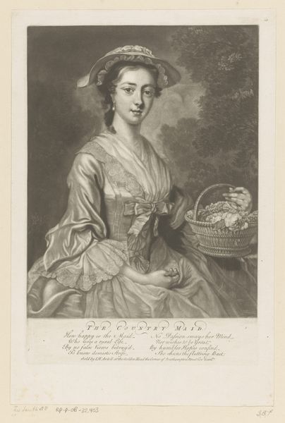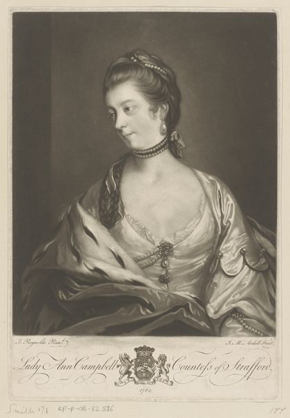 James McArdell created this mezzotint portrait of Anne Dawson as Diana, likely sometime in the mid-18th century. The artwork reflects the fashion for aristocratic portraiture in Britain at the time, particularly the vogue for representing society figures in the guise of mythological characters. Here, Anne Dawson is cast as Diana, the Roman goddess of the hunt. She is holding a spear and wears a crescent moon in her hair, a familiar attribute of the goddess. Note the presence of the dog, and the rolling hills in the background, evoking the countryside settings associated with Diana. It is worth remembering that aristocratic identity was strongly linked to land ownership and country pursuits. This artistic choice wasn't merely aesthetic; it reinforced the sitter's elevated social status. Historians can delve into estate records, fashion trends, and even mythological texts to uncover the full significance of such portraits. The meaning of art is always contingent on its social context.
