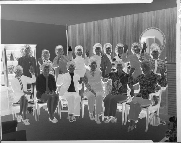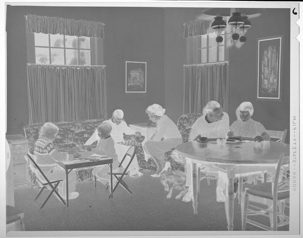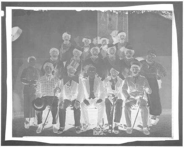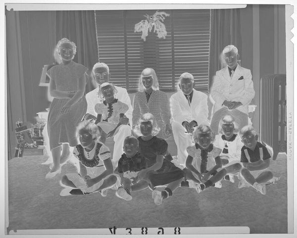 Curator: This intriguing piece, currently held at the Harvard Art Museums, is an untitled photograph by Ken Whitmire Associates, portraying a large group portrait of a women's club. It measures approximately 10 by 12 centimeters. Editor: Immediately, I’m struck by this stark, almost ghostly quality. The reversal of tones throws me off balance, like a memory fading in and out. There's something inherently intimate in the composition, though. Curator: Indeed, the negative space and reversed tonality draw attention to the structural elements. Observe how the uniformity of the group is contrasted with the individual expressions and clothing, a semiotic interplay between collective identity and personal narrative. Editor: For me, it's less about the structure and more about the feeling. There's a sense of community, shared purpose, but also the inevitable passage of time. Each face tells a story, even in monochrome. Curator: A keen observation. The medium itself, a photographic negative, emphasizes the artifice of representation, a deliberate construction that reveals and conceals simultaneously. Editor: So, it's not just a snapshot, it's a commentary on how we remember? I think it evokes a sense of nostalgia, a longing for connection in a world that feels increasingly disconnected. Curator: Precisely. It leaves us to reflect on the power of images, the stories they tell, and the meanings we project onto them. Editor: Makes you wonder about their stories, doesn’t it? Their inside jokes, their hopes, their fears. A little window into a world we'll never truly know.