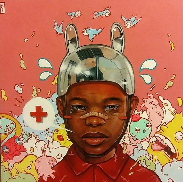 Kayla Mahaffey’s ‘Level Up’ is made with acrylics on canvas, using a combination of techniques that speak to our contemporary moment. Mahaffey’s paintings often merge portraiture with elements of cartooning and video games, and this is definitely the case here. The anonymous figure looks straight at us, asserting her presence. The cat-eared helmet and glove suggest a sense of readiness, even armor, while the background teems with the language of the screen. She renders all of this with fluid brushwork. Acrylic lends itself well to this approach. It has become the default choice of painters who want a crisp, graphic quality. As a material, it's a child of the twentieth century, and can be seen as a somewhat industrial alternative to oil paints. Ultimately, Mahaffey’s careful crafting suggests a reality that is constantly being updated, enhanced, and, yes, levelled-up.