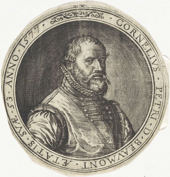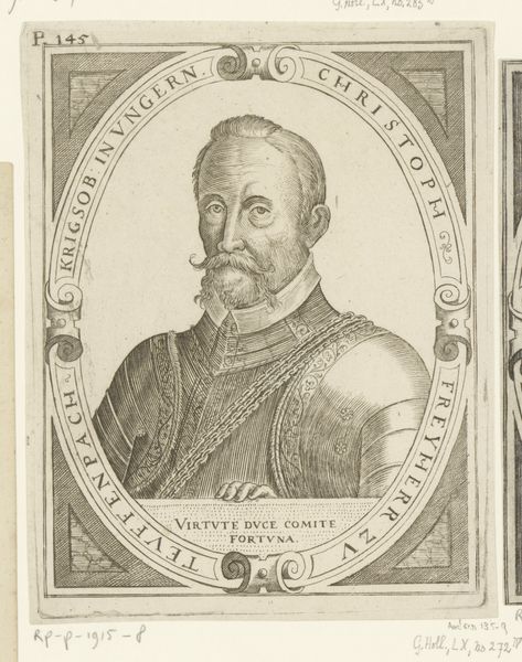 Editor: Here we have "Portret van Christoph von Teuffenbach", made between 1590 and 1611 by Hans Sibmacher. It's an engraving, so a print. The aged paper really adds to its character. What story do you think this image is trying to tell? Curator: This engraving immediately brings to mind the political function of portraiture during the late Renaissance. Consider the subject, likely a member of the aristocracy. These portraits weren't mere likenesses, but carefully constructed images designed to project power, lineage, and virtue. Notice the armor – what message does it send? Editor: It gives the impression of military might, doesn’t it? Ready for battle. But printing a portrait - was that unusual then? Curator: Exactly. The dissemination of images through print made portraits accessible to a wider audience, allowing the sitter's influence and reputation to spread beyond their immediate circle. The choice of engraving as a medium also suggests something. Consider how this contrasts with painted portraits commissioned by only the wealthiest patrons. How might printmaking democratize representation? Editor: That's interesting. It feels like it could be both a tool of power and a way to connect with people outside the elite. Curator: Precisely. It invites a critical look at how identity and social standing were constructed and circulated in early modern Europe, prompting one to consider the complex interplay between art, politics, and public image. What does the Latin inscription at the bottom suggest? Editor: Maybe it emphasizes virtue and fortune? I'm starting to see how much more is communicated here beyond just a person's appearance. Thanks! Curator: Indeed. It's a powerful reminder of how art shapes and reflects social structures.