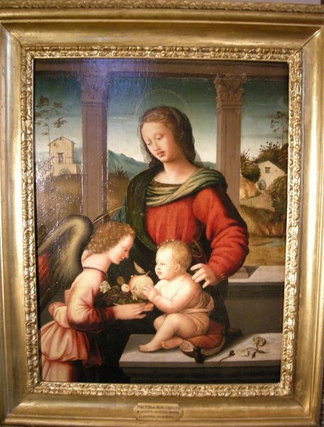 Editor: Here we have Filippino Lippi’s "The Holy Family with Saint John the Baptist and Saint Margaret," painted around 1490 with oil on wood. It strikes me as quite a formal composition, almost staged. What draws your attention most in this piece? Curator: The first thing that strikes me is the sheer material wealth embedded in this oil painting – consider the source of pigments: where did the lapis lazuli for Mary's ultramarine robe originate, and what did its extraction and trade entail? Who would have been able to afford such a work, and what was the purpose of its creation and consumption? Editor: So, it’s not just about the spiritual representation, but the earthly realities of its creation? Curator: Exactly! The craftsmanship of this ‘high art’ cannot be separated from the labor, global trade routes, and systems of power and religious patronage of the era. Think about the cost and labour of preparing the wood panel itself. And how does the meticulous detail affect the social context? Does it solidify the upper class or allow new patrons to elevate themselves through acquisition and consumption of art? Editor: That perspective really shifts how I see it. Instead of just admiring the figures, I'm now thinking about the artisans, trade routes, and power dynamics involved. It almost becomes a snapshot of the socio-economic structures. Curator: Precisely! Seeing art through the lens of its material production provides insight into a broader historical narrative often omitted in more traditional interpretations. It forces us to consider art not just as aesthetic or spiritual, but as deeply embedded within networks of labor and exchange. It really humanizes the piece in a new way. Editor: I’ll never look at ultramarine the same way again! Curator: Indeed. Considering material realities brings history to life.