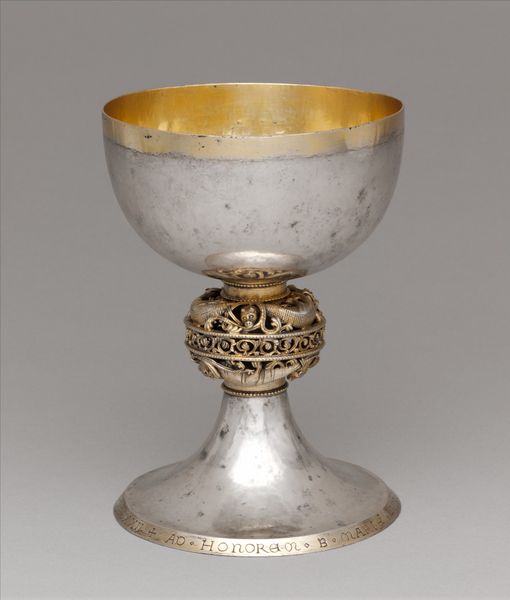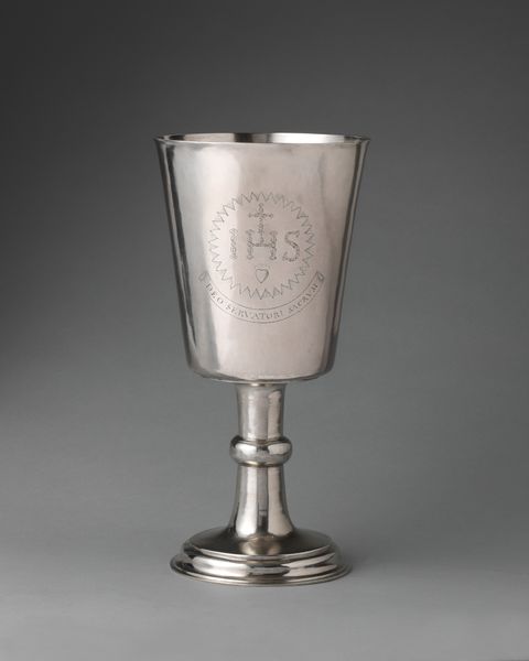 Curator: Take a moment to observe this Communion Chalice, a remarkable object from around 1794. You'll find it residing at The Art Institute of Chicago. Editor: It strikes me immediately with its austere beauty. The cool, silvery metal and simple lines almost give off an aura of quiet contemplation. Curator: Precisely! It's an exquisite example of Neoclassical design rendered in metal. Neoclassicism, as an artistic movement, looked back to the art of ancient Greece and Rome, favoring symmetry, order, and clarity. Editor: And I can see it in the chalice’s restrained ornamentation. The overall effect is very graceful. Yet, you also sense its utility—that it wasn’t just made to look at, but to serve a specific function. Curator: Indeed, it served the crucial function of holding the wine during the Christian sacrament of Holy Communion. The chalice is not just an aesthetic object; it's loaded with religious symbolism. Consider how objects can acquire this "aura" of importance. Editor: Thinking about the communities who might have used this makes you reflect on this. I wonder what kinds of ceremonies and what hopes or beliefs it was meant to evoke. It must have held deep meaning for someone. Curator: We might never know for sure what lives this piece has witnessed or the exact hands that held it aloft. But that, in a way, adds to its quiet mystique. What do you take away from this reflection? Editor: I find it humbling. Considering how many events happened on our planet at the same time as its creation, but yet it is a calm still vessel meant for reflection.
