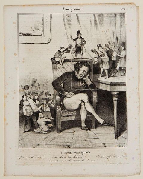 Editor: This is "Punishment of Boys in School" by Bartolomeo Pinelli. It is a small print, and the scene is… well, chaotic! What's your take on all this? Curator: Ah, Pinelli! I imagine his Rome smelled of figs and charcoal. Here, he captures a very human drama. The teacher, perhaps overwhelmed, the punished boy’s grimace, the other children’s mixture of fear and fascination…it’s a small window into a world of childhood. Editor: It’s funny and unsettling at the same time! Thanks for pointing out that range of emotions. Curator: Exactly! It’s in those contrasts that the real story lies, isn’t it?