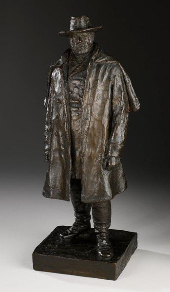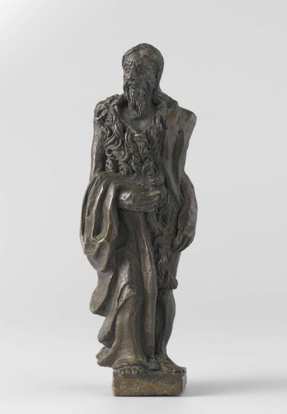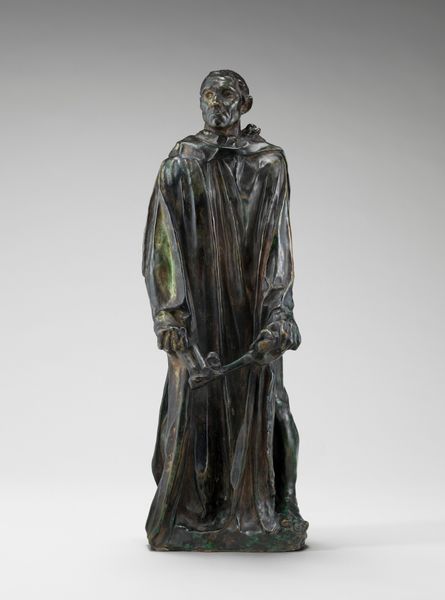 Editor: This is Auguste Rodin's bronze sculpture, *A Burgher of Calais (Jean d'Aire)*, likely from 1889, residing at the Art Institute of Chicago. I find his expression incredibly moving. What stands out to you in this piece? Curator: What I see is a powerful meditation on public service and sacrifice. Rodin wasn’t simply depicting an individual, Jean d'Aire, but evoking a pivotal moment in French history during the Hundred Years’ War, a story freighted with national identity. What do you know of the history that inspired this work? Editor: I remember reading about the Siege of Calais... Wasn’t it about these citizens offering themselves to the English king to save their city? Curator: Exactly! Rodin depicts Jean d'Aire and five other burghers, prepared for execution. Now, consider the politics of imagery at play here. This wasn't commissioned as a triumphant monument. Instead, it captures vulnerability, hesitation even. How does that contrast with traditional war memorials of the time? Editor: Those typically glorify heroic victories, but this… it humanizes the cost of war, the psychological burden carried by these men. It challenges the idea of patriotism being purely about aggression and domination. Curator: Precisely! And Rodin intended for the sculptures to be placed at ground level, forcing the public to confront these figures directly, to grapple with the complexities of civic duty. How does this affect your experience of the piece? Editor: It definitely creates a sense of intimacy, a connection to their suffering that's really immediate. Seeing them on a pedestal would create emotional distance, almost turning them into untouchable heroes, whereas now it feels like they are fellow men. I hadn't considered the positioning so important. Curator: Museums and public spaces contribute crucially to our understanding of Art History, wouldn't you agree? Editor: Absolutely. I see how crucial historical and socio-political forces shape our perspective and make these stories far more complex and relevant than I previously realized.