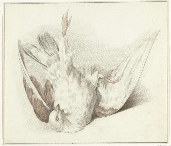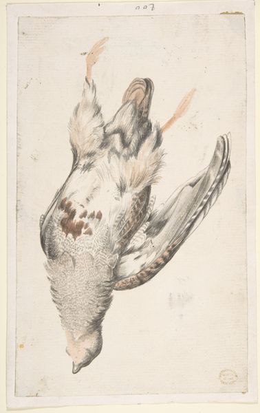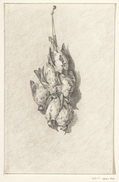 Jean Bernard made this piece, titled "Two Dead Birds, Hung on a String," sometime before his death in 1833. The delicate rendering of these birds evokes a complex mix of emotions, reflective of the era's changing attitudes towards nature and mortality. During Bernard's lifetime, the late 18th and early 19th centuries, Europe saw both an increased scientific interest in the natural world and a growing sentimental attachment to it. Images of dead animals, while sometimes purely scientific, also served as memento mori, reminders of life's fragility. The depiction of these birds raises questions about humanity’s relationship with the natural world. Are they specimens for study, trophies of the hunt, or symbols of loss? This piece allows us to reflect on our place within a larger ecosystem and consider the emotional weight of our actions.