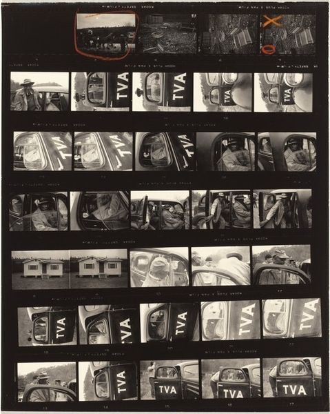 Robert Frank made this black and white photographic contact sheet, titled "Self-portrait in rear view mirror--Hollywood 43", sometime in the 1940s. Frank's image offers a glimpse into the artist's perspective. The contact sheet format, a direct print from the negative strip, suggests an intimate, unedited view into Frank's artistic process. It's a work of art but also a record of the artist's work. The repeated image of the rearview mirror becomes a motif, framing the world outside the car. Made in Hollywood, the image hints at the car culture and the constant movement of American life. Frank, a Swiss immigrant, often turned his lens on the social fabric of the United States. What was the public role of photography at the time? And what kind of social conditions shape the photographic archive? By examining Frank's work through the lens of cultural and institutional history, we can better understand the role of photography in shaping our understanding of American society. Resources such as Frank's biography and essays, or studies on photographic practices of the mid-20th century can provide additional insights into this work.