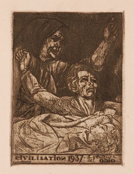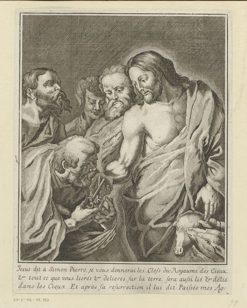 Curator: It looks… intensely uncomfortable. Editor: Indeed. Let’s consider Jan van der Bruggen’s "Keisnijder (het Gevoel)," dating roughly from 1659 to 1740. The medium here is an engraving, and what immediately grabs your attention is this powerful, unflinching depiction of what I'm presuming to be a street barber or quack “cutting for the stone.” Curator: The central image is arresting, there's no getting around it. But what cultural meanings might resonate? Beyond the obvious visual story? I imagine, for common folk, these practices held an almost mythical power. How does this image play into broader societal anxieties about charlatanism and medicine during the Baroque era? Editor: I think we cannot discard that fear and the anxieties over charlatanism that prevailed. Visually, the image screams of both trust and terror, the exaggerated expressions create a theater of human experience, evoking a visceral empathy. The symbols of headwear, perhaps implying social status in the play of dominance? I am fascinated with the fact the person at pain seems to hold onto the hat to ease the pain. Curator: The artist clearly revels in rendering emotion. These graphic depictions were not just observations; they actively participated in shaping public discourse around healthcare at that time, raising very palpable and raw questions about ethics and efficacy. Think of broadsides that disseminated news and satire, this image belongs right there with a role of social critique! Editor: Precisely, the scene is reminiscent of theater. We have, on one hand, someone in an extremely vulnerable state subjected to an uninvited intrusion in the body and an unsolicited manipulation that causes pure agony; on the other hand, the aggressor or “specialist,” a dominant role performed by a grotesque yet sure demeanor. But I agree with your point about these prints serving as accessible visual commentary for a wider audience on popular believes! Curator: Thinking of those anxieties and this widespread lack of medical expertise really gives context to art like this. And with a renewed interest in health today this piece creates such a link. Editor: Looking at the emotional symbolism and that immediate pain sensation gives me chills. Thank you.