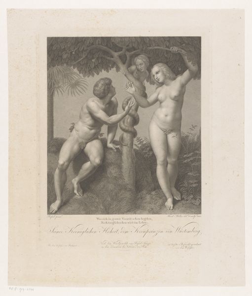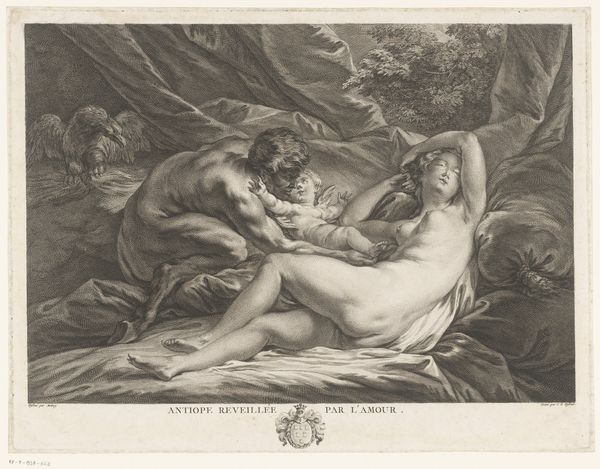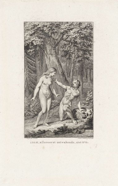 Curator: Here we have "Daphnis and Chloe Bathing," a work by Joseph Lemercier created sometime between 1813 and 1887. It’s an engraving, currently held here at the Rijksmuseum. What strikes you first about this piece? Editor: The figures are so pristine and staged. Their nudity is almost… antiseptic. There is something unsettling to me about the almost clinical gaze. Curator: It reflects the Neoclassical style, a conscious revival of classical antiquity’s aesthetics. These artworks often played a vital role in constructing specific ideas about history. We see this especially with how ideas from art helped advance agendas that excluded marginalized identities. Consider the inherent power dynamics at play, reinforced by how the artwork's ownership, display, and interpretation function. Editor: The composition certainly directs our attention. The implied narrative and power dynamic, the supplicating man and the demure woman, really stands out when contextualizing it within social constructions. Are they a study in vulnerability, a testament to gendered roles? Curator: Lemercier, through this etching, engages in a larger artistic and social conversation. By referencing a classical story, it not only aimed to present beauty but to also promote ideals and morals accepted at that time, a period with strong social biases and gendered norms. The etching process itself, its accessibility and reproducibility, played a part in disseminating these messages widely. Editor: Looking at the landscape backdrop and even the treatment of water, one has to consider not only the historical gaze embedded within, but also its broader impact on other artists’ notions about representing nature. Was this received as romantic? How might interpretations differ when engaging with post-structuralist methodologies that center issues of power relations and dominant cultural ideologies? Curator: Absolutely. The interplay between classical mythology and its reception speaks volumes about the ongoing negotiations and reinterpretations of history, even to the current moment. It emphasizes the importance of addressing it from all social perspectives. Editor: This work clearly offers more than pretty scenes; it provokes critical considerations about the making and circulation of art and cultural value itself. Curator: Precisely, inviting viewers to understand its role and legacy critically, particularly as relates to cultural biases.
