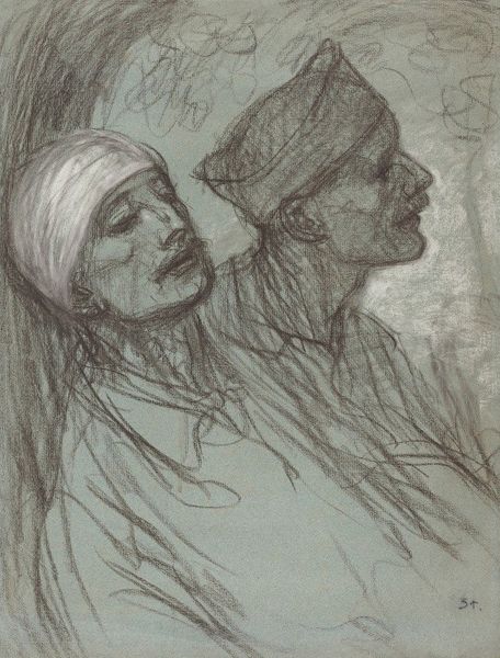 Théophile Alexandre Steinlen made 'Vente de Charite' in 1916, using conté crayon on paper. The rough, immediate quality of the drawing medium beautifully matches the subject's social and economic status. You can see the layering of the strokes, which allows Steinlen to model light and shadow, and add depth to the forms of the figures. The tooth of the paper grabs at the crayon, creating a slightly ragged effect, which gives a palpable sense of the men's hardship. It’s a work that acknowledges a raw, economic exchange, revealing the human condition within the throes of societal and political change. It reflects the labor involved not only in its making, but also the labor that is at the heart of its narrative. Paying attention to the materials and the making, allows us to break down traditional hierarchies between fine art and craft, inviting a broader understanding of the artwork within its social and historical context.