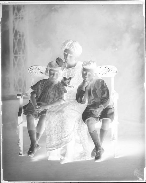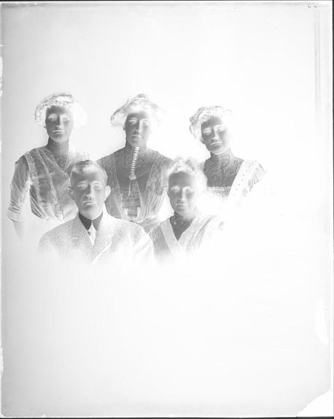 Curator: This arresting image, titled "Untitled (family of four posed in studio)," comes to us from the Hamblin Studio. Editor: There’s such a ghostly, ethereal quality to it. It almost feels like a dream, or a memory fading at the edges. Curator: Indeed, the photographic negative, measuring roughly 10 by 8 inches, gives the impression of a world captured, yet somehow distanced. What I find striking is the family's formal attire against that stark background. Editor: Yes, and that formality really speaks to the ritual of portraiture at that time, doesn't it? The stiff poses, the carefully chosen clothing... it's a performance of family, almost. I wonder what they were truly like. Curator: The Hamblin Studio likely captured many such family portraits, each a small mirror reflecting the aspirations and social dynamics of its time. Editor: It's a poignant reminder that even in these staged moments, a truth, however refracted, can shine through. A fascinating look into the past.