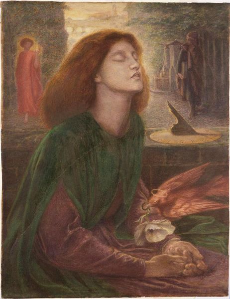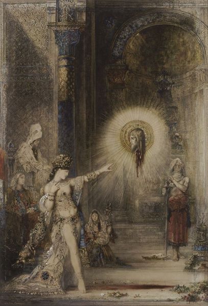 Curator: Look at this piece. Gustave Moreau's "Saint Cecilia," likely created between 1885 and 1900, now residing here at The Met. A watercolor, I believe? Editor: Oh, a dream. My first thought? Serenity tinged with melancholy. The colors are muted, but the gold halo and harp pop. There's a lovely sadness to it. Curator: Yes, and Moreau was deeply immersed in Symbolism, wasn’t he? Cecilia, the patron saint of music, is often portrayed playing the organ, but here she's depicted with a harp. This subtle shift opens up interesting interpretations. Perhaps the harp's associations with antiquity appealed to Moreau's interests in historical myth and archetype? Editor: It feels far more intimate this way. The organ is so… public. The harp suggests private devotion, almost a secret language with the divine. You can almost hear a quiet melody echoing in the stillness of that landscape. What's with the setting though, leaning against what looks like a rough tree trunk with one lily and a lake in the background. It feels both earthly and ethereal. Curator: Moreau frequently employed very particular visual vocabulary to speak to larger ideas. Note the positioning of the crescent moon as well. The lily connects Cecilia to innocence and purity, and to rebirth as it also the symbol of Resurrection. That tree and the rocks are reminiscent of natural sacred spaces like holy wells. Moreau’s personal language of forms certainly invites meditation on mortality and the transcendent. Editor: Absolutely. She's grounded but reaching for something beyond, don't you think? That upward gaze. It all creates a wonderful tension. It makes me wonder if she’s actually playing the harp or merely embracing it to produce an inaudible vibration in an otherworldly fashion. I find this work deeply affecting, almost mystical in the subtlety of the color palette that gives form to the artist's interiority. Curator: I see her act of contemplation reflecting that Symbolist ambition to evoke subjective realities of emotion and experience. Moreau certainly achieved a timeless quality, which continues to affect modern audiences. Editor: It certainly does, I love the chance this has given me to escape to a secret place. Curator: For me, the synthesis of musical harmony and visual symbol makes me feel I know just a little bit more about the long evolution of shared memory.