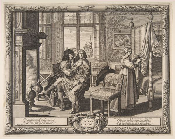 Editor: This engraving by Abraham Bosse, titled "Childbirth," created in 1633, depicts exactly that. What strikes me is the composition—how Bosse manages to convey so much within this framed scene. How do you approach the analysis of a piece like this? Curator: Formally, the tight composition underscores the intimacy of the event. Observe how the strong lines of the architectural elements—the bed, the window frame—bisect and contain the figures, directing the eye to the central action. The print’s success hinges on the balance of the chaotic energy of birth with a structured, almost geometric, arrangement of space. Note, too, the texture achieved through the meticulous use of line in the engraving process. What does the light reveal? Editor: I see, the light from the window emphasizes the depth of the room. And all the lines definitely give it a sense of… texture. Curator: Precisely. It animates the fabrics, the skin, and differentiates the surfaces. More theoretically, this piece presents an interesting study in semiotics. What meanings can we ascribe to the various objects and figures depicted? Editor: Hmmm, are you saying the figures might symbolize something else beyond the surface? Curator: Indeed. What of the contrast between the active midwives and the seemingly passive mother? What about the open chest, full of linens – are these not potent signifiers within the depicted domestic space? It's a fascinating system of visual rhetoric. Editor: I hadn’t considered that, looking at it that way reveals the many layers embedded in its forms and techniques. Curator: And by appreciating these internal structures and signifying systems, we unlock a more profound understanding.