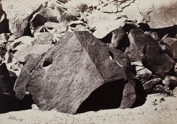 Curator: Standing before us is Frederick Sommer's "Rocks (Utah)," a photograph from 1973. Sommer, known for his surreal and abstract compositions, presents us here with something seemingly more straightforward: a landscape of rocks. Editor: My first impression is weight, sheer weight. The monochrome palette emphasizes the textures and the density of the stones. There’s almost a crushing feeling, a geological claustrophobia. Curator: Exactly. And in the context of the American West during the 70s, Sommer's choice of subject echoes concerns around land use and environmental degradation, even if subtly. He studied with Edward Weston; this image displays an awareness of realism in the visual culture. Editor: And yet, it's more than just a document. Rocks have such ancient symbolic associations: stability, permanence, even refuge. Notice how they seem to almost tumble towards the viewer. Curator: Sommer, with his European roots, may have wanted to engage with mythic landscapes as seen throughout visual culture. The American West, here, serves as his stage for a re-imagining of the world, perhaps referencing Old World stories. Editor: Yes, I see echoes of classical ruins—fragmented grandeur and stoicism. They also could function as monuments. Are these metaphors for lost civilizations? Curator: Well, while this shot was captured in the state of Utah, Sommer may have hoped for something beyond locale. As a conceptualist, he could have tried to make a larger commentary. And despite Sommer’s stated disinterest in politics, this photograph participates in socio-political discourse whether intentionally or not. Editor: His technical mastery is impressive, the detail is immaculate; those granular textures… So in the end, "Rocks (Utah)" is deceptively rich with many different angles. Curator: Absolutely. Sommer offers an intersection of stark realism with deeper concerns over identity, visual tropes, and more. He made us reconsider our relationship with both artistic traditions and environmental history.