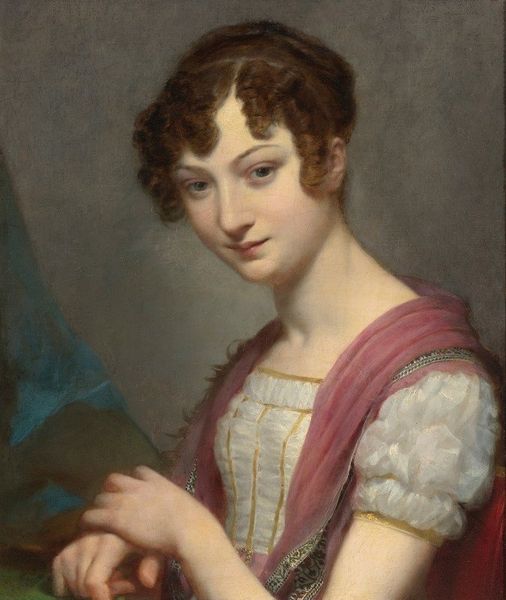 Editor: Here we have Vladimir Borovikovsky's "Portrait of Elena Alexandrovna Naryshkina," painted in 1799. It’s an oil painting. She looks so demure and delicate, almost like a porcelain doll set against a vaguely ominous backdrop. What stands out to you in this piece? Curator: Isn't she lovely? To me, this portrait feels like a whisper of longing. Borovikovsky was a master of capturing a certain...ethereal quality. See how her gaze is soft, almost unfocused? She's *present*, certainly, but there's also a sense she’s lost in thought. And those roses! Symbols of beauty, fleeting youth... it's all very romantic, isn't it? Does that resonate with you? Editor: Yes, definitely. I see the romantic elements, and the fleeting youth aspect for sure! Is there anything in the background, beyond the sort of typical romantic garden, that provides meaning or a clue to the sitter? Curator: The somewhat shadowy, undefined background…I don't think it is about a specific garden. It’s about evoking a mood. This wasn’t about capturing reality but rather about constructing an ideal. She is, in many ways, presented as an icon of feminine virtue, set apart, contemplative, almost melancholy. It’s not quite *real*, is it? It’s something…more. Editor: So it's about the idealized image more than a true representation. I can see that. The background definitely contributes to that dreamlike feeling. Curator: Exactly! It makes you wonder what dreams and reflections might hide behind those eyes...it makes this far more poetic and mysterious. Editor: It's fascinating to think of portraiture like that—creating a world rather than just mirroring one. I’ll never look at another portrait the same way. Thanks! Curator: My pleasure. It is about conjuring more than recording - it is what whispers to me, anyway!