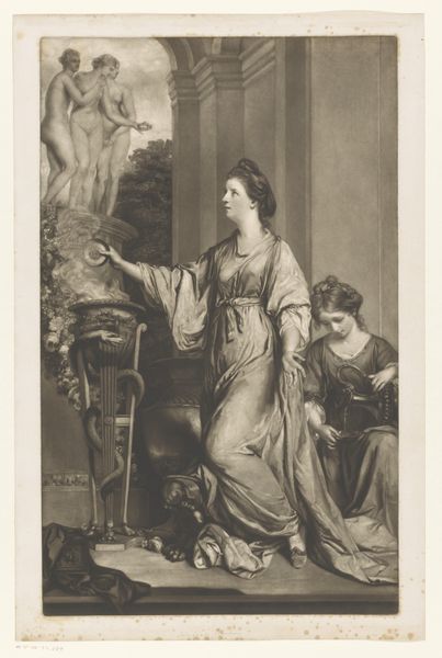 James Watson made this mezzotint titled *Elizabeth, Duchess of Manchester and Her Son* in the latter half of the 18th century. At this time, portraiture was a way for the elite to convey not just likeness, but also status, power, and cultural ideals. Here, the Duchess is presented in the guise of Diana, the Roman goddess of the hunt, a common trope at the time. But this image does more than just flatter; it engages with contemporary notions of motherhood and femininity. The presence of her son complicates the classical allegory, adding a layer of sentimentality. Traditionally, women in society, especially those of high status, were often portrayed as symbols of virtue and motherhood. The Duchess's attire and pose reflect these expectations, yet there's also a hint of individuality in her gaze and posture. Through its allegorical language and attention to detail, the artwork offers a glimpse into the complex negotiations of identity, representation, and social expectations in 18th-century Britain. It invites us to reflect on the ways women navigated their roles within a patriarchal society, using portraiture as a means to both conform and assert their presence.