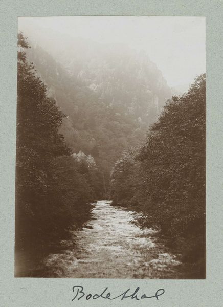 Editor: This is "Kloof met de Duivelsbrug in het Bodedal in de Harz," a gelatin-silver print photograph from around 1870-1890 by E. Rose. I’m struck by the imposing grandeur of the landscape, but also a bit chilled, to be honest. It’s… dark. What's your interpretation of this work? Curator: Indeed, there's a palpable sense of sublime power at play here, channeling Romantic ideals. Consider the Devil's Bridge itself. Bridges often symbolize connection, transition, but the name inherently ties it to something… darker, perhaps even the struggle against or with evil or the unknown. Given the rise of industrialization at the time, how might this romanticized, yet unsettling, natural scene speak to anxieties about modernity and humanity’s relationship with a rapidly changing world? Editor: So, the darkness and slightly frightening mood reflect the social anxieties of the time? Curator: Precisely. This image captures that tension. What seems like a beautiful natural scene is infused with a sense of foreboding. Landscape photography of this era wasn't just about pretty pictures. Think about the context: Germany's unification was happening, there was burgeoning nationalism, and a growing fascination with folklore and legends, which often involved darker themes. The Devil’s Bridge itself, appearing almost fragile against the overwhelming landscape, might be seen as a metaphor for the precariousness of progress. Editor: I see...so it is an active reflection on social issues using a particular place, instead of a purely passive landscape portrayal. Curator: Exactly. It invites us to consider the narratives embedded in the land and how those narratives intersect with identity, progress, and even fear. It prompts questions about whose "progress" is being represented and who might be marginalized by it. Editor: That gives me a lot to think about regarding how landscape art and photography participate in a complex historical narrative! Curator: It’s fascinating how a seemingly simple landscape image can open up such rich avenues for exploration.