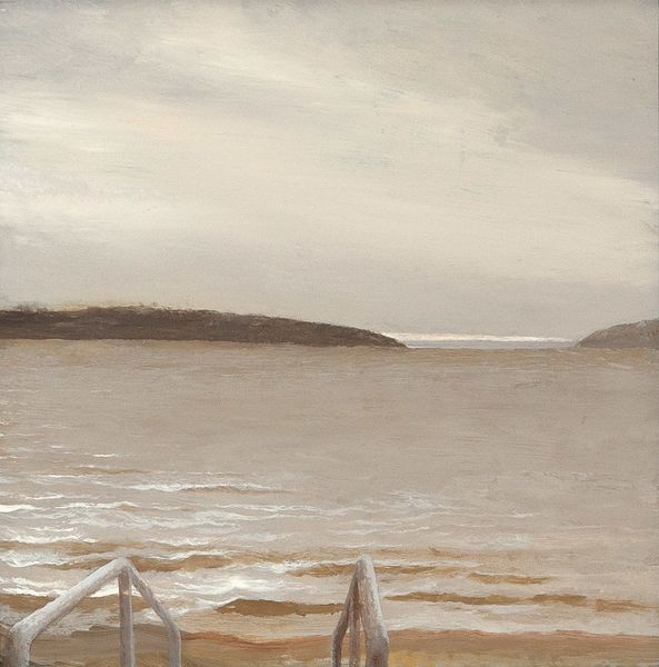 Editor: We're looking at "Seaside at Arad Fort" by Rashid Al Khalifa, created in 1987. It's a vibrant painting that captures a seascape. I find the brushstrokes create a shimmering effect, especially on the water. What strikes you about the composition and technique in this piece? Curator: The interplay of colour here is intriguing, isn’t it? Notice how Al Khalifa juxtaposes the cool blues and greens of the water and sky with the warmer yellows and browns of the shore. The visible brushstrokes contribute significantly to the texture and depth; consider how they guide the eye and construct the form, almost independently of any mimetic function. Is the perspective linear, atmospheric, or something else entirely? Editor: I see what you mean about the colours. It almost vibrates! It feels very evocative. It makes me wonder about the point of view. It's not exactly like I'm standing there, but it feels like a real place. It's not hyperrealistic but... the colours evoke light so vividly! Curator: Exactly! Focus on how colour relations work, the flatness of some areas, the textures and juxtaposition that do create spatial illusion... Also, how do you interpret the presence of the small boat? Is it an essential component of the composition, or perhaps symbolic within the landscape? Editor: Hmm, I hadn't considered the boat as symbolic. Perhaps it's there to give a sense of scale, emphasizing the vastness of the seascape. Also the human element adds something more specific in terms of subject than say just a bare beach with sky and sea. Curator: Precisely! We might observe how it anchors the composition and adds depth of human activity amid the broader scheme. Now that you point out about subject - a question for you, and other considerations of form: Could Al Khalifa be making commentary or expressing an experience? Editor: Well, this makes me appreciate how every aspect of an artwork, from the colour palette to composition contributes meaning beyond just the immediate image. It feels so much richer to understand. Curator: Indeed. Attending to the formal properties enriches our encounter with the work of art. I, too, discovered an extra dimension, revisiting what's truly there within "Seaside at Arad Fort".