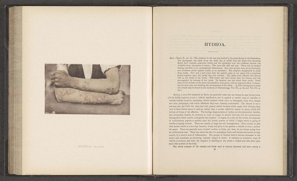 Curator: Before us, we have an intriguing print from before 1881 titled "Patiënt lijdend aan de huidziekte 'purpura simplex'," attributed to an anonymous creator. The print is part of a larger compilation of photography, a curious mix of artistic documentation and medical observation. My first thought goes to its somber palette. Editor: Yes, it's dominated by a muted sepia tone, isn’t it? The constrained tonal range amplifies the textural details of the photographic image set against the page. There’s a certain severity to the limited values that focuses the viewer's attention so pointedly. But knowing a little more, seeing this within a context of medical archives, one can imagine what sort of treatment the patients would receive and the social structures from which these vulnerable communities of people were supported, and sometimes denied proper care. The starkness becomes all the more meaningful. Curator: Absolutely. This work resides at the intersection of medical science and representation, reflecting, perhaps, the period's shifting understanding of illness, identity, and visibility. It speaks to issues of power, how bodies are documented, and the narrative authority granted to both artist and doctor. Editor: Power is key. By framing the patient's suffering as an art object, the photograph elevates the aesthetics of medicine and scientific exploration above empathy. However, from a formal perspective, the very deliberate composition calls our attention to the image as crafted reality. How light plays across the texture is quite compelling. Curator: True, yet there's also the dehumanizing aspect, the stripping away of identity to showcase only the pathology, the spectacle of illness... This act reflects the pervasive historical tendency to marginalize and "otherize" bodies deemed different. This particular medical condition becomes an exhibit, displayed for consumption within certain power structures. Editor: A complex tension, for sure. It seems these visual dynamics, set within the rigid format of the academic approach, offer insight into the gaze and methods of cataloging during this era. Curator: Indeed. The confluence of the formal, technical and aesthetic aspects creates an arresting piece, even, perhaps especially, given its complex and disturbing background. Editor: Yes, its severity of form belies its complex social reality.