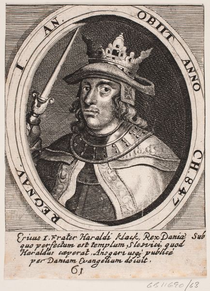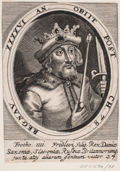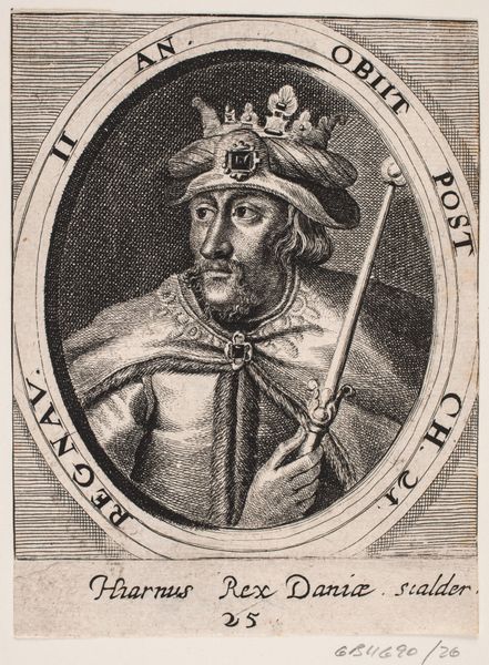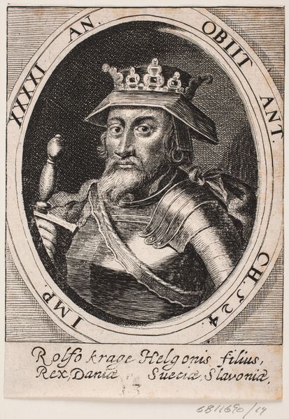 Editor: This is "Kong Skjold," from 1646, a print of some kind held at the Statens Museum for Kunst. It feels rather… austere, I think. There's an interesting emphasis on line. What do you see in terms of its production? Curator: The engraving itself is paramount. Look at the precise labour required to create those fine lines, the sheer mechanical skill involved in replicating this image for wider consumption. We see a mass production of sorts, transforming the portrait into a commodity, less about individual likeness and more about propagating a certain idea. How does that impact your understanding of portraiture? Editor: So, it's less about the individual "Kong Skjold" and more about what he *represents* and how that's communicated widely? Does the material then dictate the meaning more than the subject? Curator: Precisely! The printmaking process democratizes the image. It's about the ability to disseminate power and authority on a scale never before imagined, through relatively inexpensive materials and techniques. Consider the socio-political context: who had access to these images? What was the message intended for them, versus, say, a hand-painted portrait only the wealthy could afford? Editor: So, this isn’t just an image; it’s evidence of evolving means of production impacting society? Curator: Absolutely! The very materiality of the engraving reflects and shapes social structures and ideological currents. Editor: That's a completely different way of looking at it! I was so focused on the "king" part, I missed the printing revolution at play. Curator: Exactly, by examining the production of the work, we are really looking at history through the lens of how it was shared and perceived on a mass scale.
