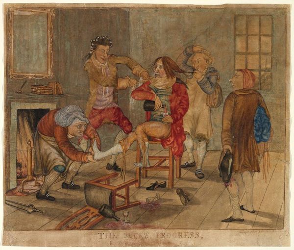 James Gillray created this print, Search-Night, to convey political commentary during a time of social upheaval. The late 18th century was marked by anxieties over radicalism, fueled by the French Revolution, and the British government responded with repressive measures. Gillray's caricature captures the paranoia of the era, depicting state watchmen bursting into a home, mistaking ordinary citizens for conspirators. We see men scrambling, fear etched on their faces, while others hide under a table, seeking refuge from the intrusive gaze of authority. The rats scurrying across the floor heighten the sense of unease. Through this print, Gillray critiques the government's overreach and the erosion of civil liberties, while also commenting on the emotional climate of fear and suspicion that gripped British society. The print serves as a reminder of the importance of safeguarding individual freedoms and challenging abuses of power. The work reflects the emotional distress and uncertainty experienced during periods of political repression.