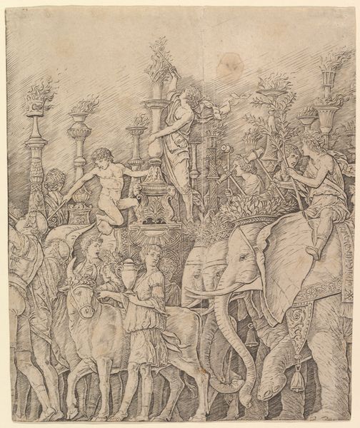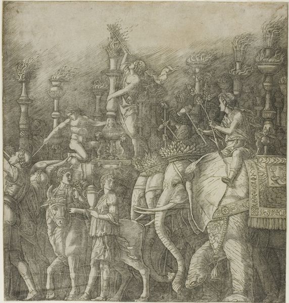 Giulio Campagnola created this engraving, 'The Triumph of Caesar: the Elephants,' around 1500, a celebration of ancient Rome. Here, the elephant emerges as more than just a beast of burden; it's a symbol of power and exotic conquest. This echoes ancient depictions, like those on Roman coins, where elephants represented military victories and imperial reach. Consider, though, how the elephant contrasts with its earlier symbolic roles. In some Eastern traditions, the elephant signifies wisdom and serenity, a far cry from its martial function here. The flames atop the candelabras evoke both celebration and destruction, a duality present in many triumphal processions. Torches are ancient symbols of illumination and purification, but here they amplify the emotional resonance of dominance. Observe how Campagnola subtly infuses the procession with an undercurrent of tension and vulnerability. This is not merely a depiction of victory but a profound exploration of the psyche.