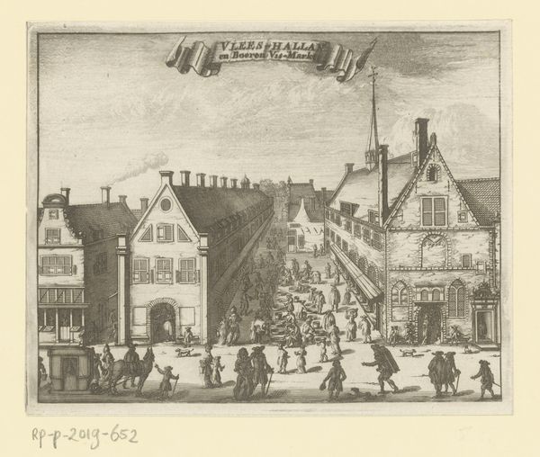 Curator: This image is Jacob van Meurs' "View of the Great and Small Meat Halls on the Nes in Amsterdam," created in 1663. Editor: What strikes me first is this hushed buzz—a strange calmness. The marketplace teeming with people, but somehow orderly. Is that the famous Amsterdam light at play, softening the edges? Curator: Indeed. Van Meurs captures the light exquisitely in this engraving, a subtle yet defining element that elevates the scene. He's rendering not just architecture, but daily life, frozen in time. Editor: I'm drawn to the figures scattered across the square, so carefully etched. They give scale and depth, don't they? A snapshot of seventeenth-century commerce. But where’s the chaos I associate with marketplaces? Curator: Look closely, you'll notice details—folks haggling, resting. Van Meurs, within the confines of his medium, provides genre-painting elements, capturing little everyday interactions that feel incredibly modern even now. Also note the vanishing point and receding orthogonal lines contribute significantly to our sense of perspective and depth of space within the artwork. Editor: It’s fascinating how he balances the rigid architecture of the Meat Halls—impressive structures in themselves, almost imposing—with the more relaxed figures. I like the presence of a cityscape and the sky. I am intrigued that it creates an ordered yet also somewhat busy scene that is appealing despite its rather limited color range. Curator: Van Meurs certainly knew his audience. There's a quiet pride, I think, in showing Amsterdam as a centre of order and industry, rather than chaos. He understood the subtle power of controlled detail, making this engraving more than a mere cityscape. It's a statement of civic pride. Editor: Makes you wonder what stories those cobblestones could tell. This isn’t just a pretty picture, it's an audio memory, ready to play the moment you lend an ear to what can be gleaned from such architectural art.