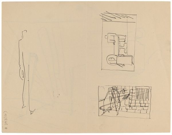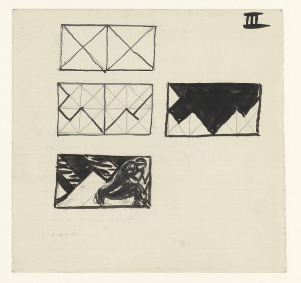 Curator: Hello there. Editor: So, this is "Compositie-studies" by Richard Nicolaüs Roland Holst, created sometime between 1878 and 1938. It’s a drawing done with pencil and ink on paper and held at the Rijksmuseum. There's something quite intriguing about this peek into the artist’s process… a real rough-and-ready feel. What strikes you most when you look at it? Curator: Oh, definitely that rawness! It's like stumbling upon a hidden world in an artist's mind, isn’t it? I think the real magic lies in witnessing how Holst experimented with abstraction. I feel that tension between geometric form and…well, a kind of embryonic narrative in those last sketches, don't you? I can almost smell the artist in his studio. Editor: It’s true. Especially with the darker panels that feature almost fantastical figures in swirling dark ink; you see that narrative impulse pulling at the formal geometry above. How does this inform our understanding of the artist? Curator: Perhaps it illuminates how even within structured exploration – almost like architectural planning – imagination finds a way to break through. See how Holst progresses from pure form to suggesting… a story? It asks: are we ever truly free from the pull of narrative, or are we destined to fill even the most abstract spaces with meaning? Makes you think, doesn’t it? It whispers of an artistic struggle and his way out to produce beauty by thinking from a story, working up into shape. Editor: That’s insightful! The tension you describe – and the hidden depths you've found – give it an unexpectedly intimate character. The way the ink defines abstract patterns... and eventually the human form. Fascinating. Thanks for shedding light on it. Curator: My pleasure! It seems sometimes the real art hides not in the polished product but in the chaotic dance of its creation. Like eavesdropping on a beautiful conversation.