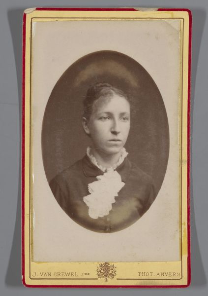 Curator: What strikes me immediately is the tonal range of this gelatin silver print—the way the subtle gradations create almost a porcelain-like texture on the boy's skin. Editor: That's an interesting observation. We're looking at "Portret van een onbekende jongen"—Portrait of an Unknown Boy—possibly created between 1873 and 1898 by Photographie Artistique of Antwerp. The piece is composed of paper employing photography, specifically using the gelatin silver print method. But beyond the materiality, the sitter is also framed within an historical lens of boyhood, class, and representation. Curator: Precisely! The use of gelatin silver processing would allow for much finer detail compared to earlier photographic methods, think about the increased output of printed media during the late 19th century... it meant a standardization and wider dissemination of these portraits. The commercial aspect becomes central; a photograph meant income for the photographer, status and commemoration for the family of the boy, isn’t it? Editor: It certainly prompts that conversation. It makes me question the role of portraiture in shaping identities, especially within a colonial context of late 19th century Belgium, given Antwerp’s history as a major port city and its links to resource extraction in the Congo Free State during that period. How might this boy's image serve as an unconscious emblem of that history? Who has the power to capture and circulate an image? How much of who the sitter actually was, can be caught on the paper? Curator: The photograph's status as a 'carte-de-visite' itself positions it within a framework of commodity exchange and social circulation. You were able to own an image of someone—be it royalty, celebrity or in this instance this seemingly upper-middle class young boy. Editor: I suppose when looking at it today we impose these social frameworks. It would be beneficial if the identity of the sitter would come to light, wouldn’t it? His fashion makes me curious of that time; from the high collar to his wool sweater vest ensemble and side part hair… Curator: It does offer a captivating glimpse into a very specific moment. It provokes an exploration of photographic techniques during a time of great social transformation and industrial growth. Editor: Exactly. While unraveling the past through art, let’s also address its resonance in today’s society, including questions of historical accountability, image ethics, and more. Curator: A fitting point to conclude; the work’s quietness prompts deep engagement.