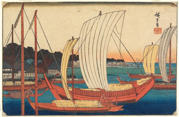 Curator: This is Katsushika Hokusai's "The Tone River in ShimÅsa Province," a woodblock print from his series "One Thousand Pictures of the Ocean." I'm immediately struck by the stillness despite the implied movement. Editor: The woodblock printing process lends itself to the subject matter here, doesn't it? The labor involved in creating these prints, the material realities... they speak to the daily lives of those depicted. Curator: Yes, the limitations of the medium paradoxically enhance the dynamic composition. The horizontal lines create a sense of breadth, while the fisherman’s posture offers a compelling asymmetry. Editor: Indeed. Considering Hokusai's context, his art was part of a larger market, reflecting the social and economic currents of his time. The demand for prints like these fueled the artistic output, and the subject reflects the importance of the river to local populations. Curator: Absolutely, and the stylized waves, rendered with such precision, almost transcend the physical properties of water. Editor: Examining the consumption of such images opens up questions about the distribution of wealth and cultural values. It's all quite interconnected. Curator: Agreed, I feel that even today, the print embodies the timeless appeal of water and humanity’s relationship to nature. Editor: A reminder of the ways art and labor are interwoven, echoing across time.