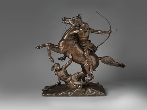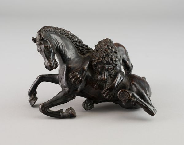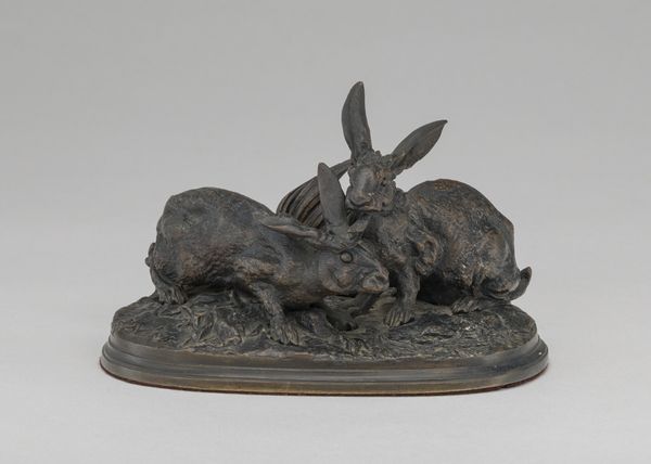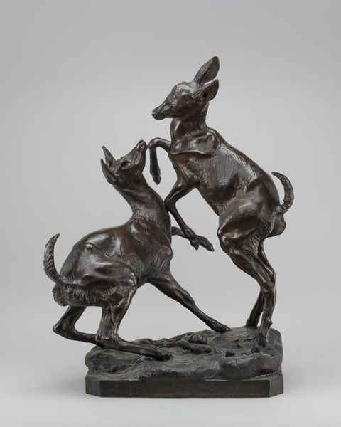 Editor: Here we have Antoine Louis Barye’s sculpture "Python and a Gnu", dating from around 1934 or 1935. It's a bronze sculpture and the scene is quite dramatic! The gnu seems to be fighting for its life against the python. How would you interpret this piece, thinking about the materials and its making? Curator: Well, immediately, the choice of bronze signifies more than just artistic preference. Consider the industrial revolution, rapidly expanding during Barye's time. Bronze, traditionally a medium of high art, becomes democratized through mass production. Does this sculpture, depicting raw struggle, hint at a commentary on the social struggles fueled by industrial capitalism? Editor: That’s an interesting thought. It makes me wonder about Barye's process, creating something so visceral in bronze, a material requiring industrial techniques. Was he intentionally blurring lines between artistic skill and industrial labor? Curator: Exactly! Barye, while celebrated in academic circles, chose a subject matter that wasn’t traditionally ‘high art.’ The dramatic struggle highlights primal instincts, questioning the polished veneer of civilization celebrated at the time. Think about the labor required to extract the materials, the foundry work - all these contribute to the meaning beyond just the image of the python and gnu. What is the artist trying to say about power dynamics in both nature and society? Editor: So you’re saying that the work and means used in the making, mirror themes that the work addresses. I hadn't thought about that. The drama here isn't just between the animals. It's between the 'high art' and industrial processes. Curator: Precisely! Consider the inherent tension. A “struggle,” if you will. Between material and subject matter. It certainly reframes how we approach a bronze sculpture like this, doesn’t it? Editor: It does! I’ll definitely be paying more attention to material choice and manufacturing processes from now on. Thank you for sharing!
