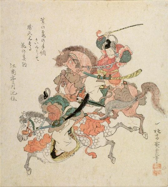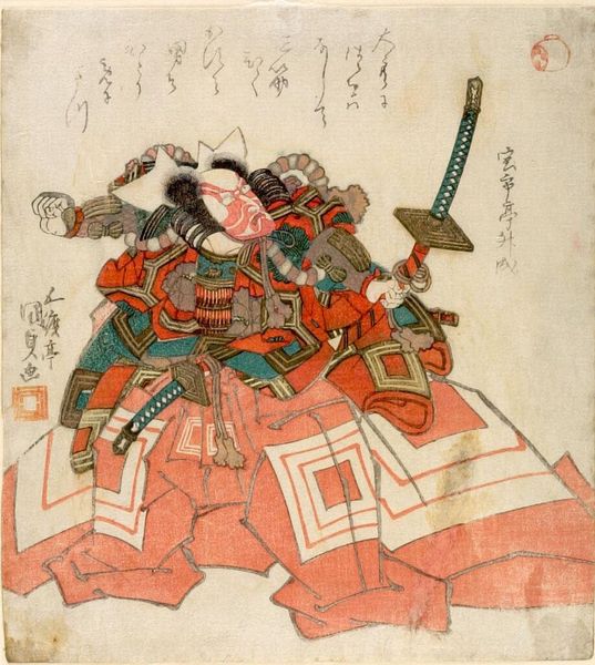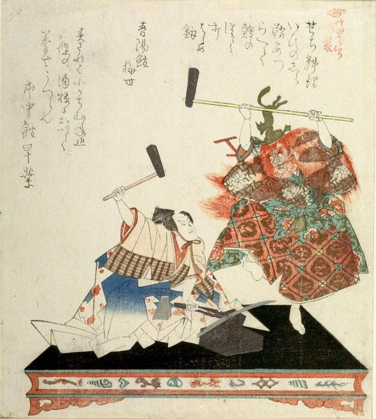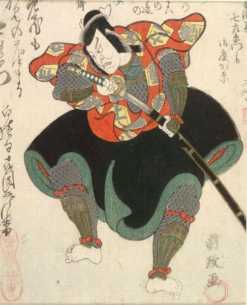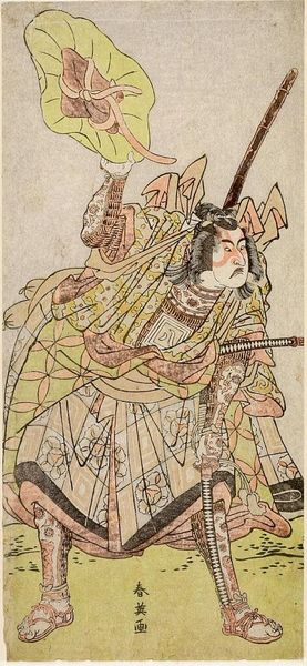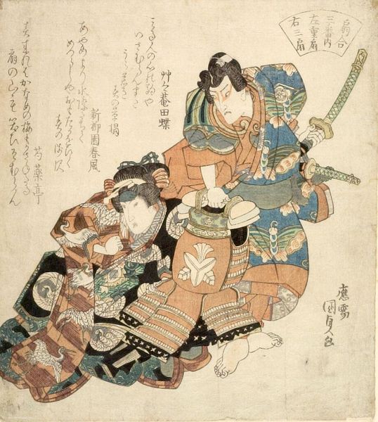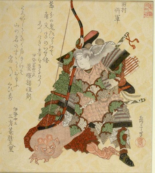 Editor: This is Utagawa Kunisada’s woodblock print, "Actor Iwai Shijaku as Toragaishi in a Soga Brothers play." The actor's costume is very striking. What do you see in the composition? Curator: The composition relies heavily on line and shape. Note how Kunisada uses contrasting patterns and bold colors to create visual interest. The diagonal line of the bow bisects the figure. Editor: The patterns are quite mesmerizing, almost obscuring the actor's figure. Curator: Indeed. Consider, too, the relationship between the flat planes of color and the calligraphic elements. The interplay generates depth and complexity. Are you drawn to anything specific? Editor: I appreciate how Kunisada balances the figure with text so that neither overwhelms the other. I learned a lot! Curator: Likewise. The print is an excellent study in form and balance.