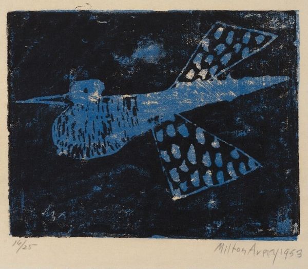 Milton Avery created this color woodcut print, Strange Bird, in 1953. Avery was part of a generation of American artists who came of age in the interwar period. His work is known for its simplification of form and subtle use of color. In Strange Bird, a yellow bird is set against a black background. The bird has a somewhat awkward, almost comical presence. Avery’s lighthearted rendering of this bird contrasts with the traditional symbolic significance of birds. Birds are commonly used as metaphors for freedom, spirituality, or the soul. The “strange bird” may be about the artist’s own sense of not quite fitting in. Avery developed a style that set him apart from the mainstream art movements of his time. He once stated, "I try to construct a picture in which shapes, spaces, colors, form a set of relationships." While grounded in personal experience, Strange Bird speaks to broader themes of identity, individuality, and finding beauty in the unconventional. The print invites viewers to reflect on their own experiences of navigating a world that often demands conformity.