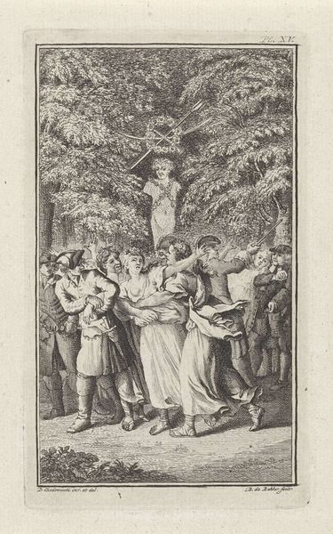 Curator: Allow me to introduce Jan Punt's "Allegorische figuren in landschap," dating back to 1759, here at the Rijksmuseum. Editor: My immediate reaction is a kind of subdued drama. The contrast isn't stark, it's a world rendered in thoughtful lines, a little play almost. What medium are we seeing here? Curator: It's an etching and engraving, skillfully utilizing those linear qualities. The figures, frozen in what I interpret as an allegorical performance, seem almost theatrical. I notice in particular the detail given to their costumes. Editor: Yes, the costumes speak volumes, hinting at status and the labor involved in their creation. I also notice the varied expressions, the faces each catching the light differently, and think this piece is rooted in accessibility via reproductive engraving—likely meant to circulate ideas about the New World through a growing consumer market. It speaks volumes of the artist's access to artisanal techniques. Curator: The allegorical language being used in that context would speak to a certain class—and what about the composition itself? The groupings of figures, the landscape receding into the background, all framed with baroque sensibilities. The arrangement of light and shadow isn't random; it leads the eye deliberately through the narrative being presented. Editor: Agreed. I'm compelled by the presence of figures within a natural, though stylized, landscape. What statement do you suppose this creates for an audience accustomed to symbolic or mythic landscapes in artwork and, possibly, exotic resource extraction in reality? It seems to weave political commentary. Curator: Certainly a commentary worth deeper investigation, as the New World was approached at this period. Jan Punt is a master here of integrating layers of symbolic meaning, framed by the tangible world represented through the meticulous details of engraving. I leave now with an appreciation for the ways that it invites inquiry beyond a singular experience, beyond any one formal reading. Editor: Me too, and the material print traditions employed show us both the skilled labor and a will to circulate new ideas around identity.