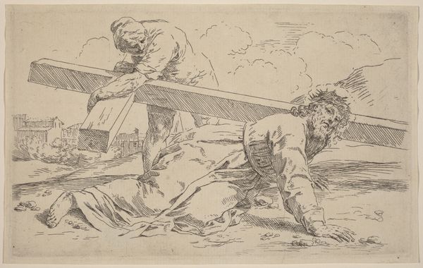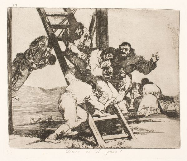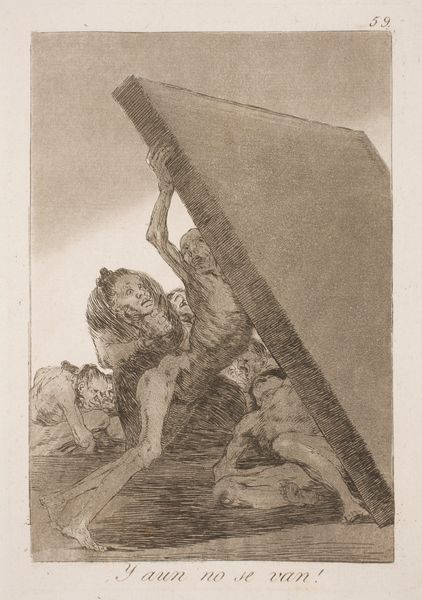 Curator: James E. Allen created this etching, "Coal Heavers," around 1935. Editor: My first thought is heat—it seems like a visual representation of oppressive heat and strenuous labor. Curator: The period Allen was working in saw a surge in art depicting industrial subjects, celebrating and also scrutinizing labor's role in society. How do you think this piece engages with that dialogue? Editor: It’s interesting. These figures are nearly monumental in their intensity. But unlike some social realist art that romanticized labor, there's a starkness here, a grit that feels more authentic to the back-breaking reality. The lack of distinct facial features almost renders them everyman symbols, stripped of individual identities. It emphasizes the universal experience of these laborers in a capitalistic society that disregards the lower working class, wouldn’t you agree? Curator: Indeed. The artist really draws our attention to this. And this kind of treatment of labor, even in art, often reveals a complex tension: appreciation coupled with a safe distance. Think about the role that these kinds of artworks have served in shaping public perception about the labor class and the effects that had, especially when it comes to political or legislative efforts. Editor: And it's the contrast between the muscular physiques and their almost ghost-like rendering, made by those repetitive linear etchings, that gets me. The men are physically present and immensely strong, yet socially invisible. What purpose is fulfilled through that visual statement? Curator: A very potent one. And given its existence as a print, it suggests this wasn't necessarily created for a wealthy collector, but rather for broader circulation, perhaps with the explicit aim of inciting social commentary. Editor: It seems Allen aimed to use their powerful forms and physical struggle to represent all those left unseen. It’s as relevant now as it was then, really. Curator: Precisely. Allen created something of enduring commentary through these few lines and shadows, asking viewers to confront uncomfortable truths.