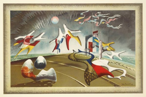 Editor: This intriguing untitled piece by Stanley Pinker uses watercolours to create a scene that's almost dreamlike in its abstraction. The geometric shapes and figures feel almost playful, but what I find most compelling is the relationship between them, and the colours employed to execute this abstract landscape, but that's just my interpretation! What catches your eye? Curator: Immediately, I consider the materiality of watercolour itself. Pinker isn't just applying pigment; he’s engaging with the very process of how water interacts with paper, how it pools and bleeds. The apparent naivete of the work, that "naive art" tag, I see instead as a deliberate dismantling of artifice. He seems interested in exposing the means of production, rather than hiding them. Editor: I hadn't thought about it that way, about the materials themselves being so present! So the 'naive art' tag diminishes that aspect? Curator: Potentially, yes. That label often ignores the labour involved and the artist's deliberate choices in manipulating the material. What's the effect of contrasting this deliberate materiality of the watercolours with those rigid geometric forms, the blocks and angular figures? Editor: I guess, seeing the rough edges of the watercolours makes the geometry stand out more, making it feel less like a landscape and more like, well, a constructed… something. Maybe a constructed set of ideas, thoughts or plans? Curator: Precisely! The very act of "making" becomes the subject. Forget the finished product as this flawless object; instead, what's on display is the raw stuff, the gestures, and the process that produces our experiences. What did you expect from an "abstraction", anyway? Editor: It is interesting to think about it like that! Thanks to the labour put into it by the artist, that challenges the idea of "high art," because its materials seem so deliberately raw, which feels refreshing. Curator: Precisely; let’s see where a deeper materialist analysis of Pinker’s ouvre takes us in deconstructing hierarchies.